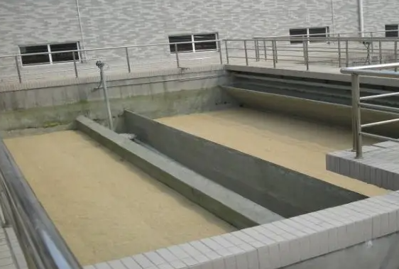 氣沖洗:打開進(jìn)氣閥,開啟供氣設(shè)備,空氣經(jīng)氣水分配渠的上部小孔均勻進(jìn)入濾池底部,由長柄濾頭噴出,將濾料表面雜質(zhì)擦洗下來并懸浮于水中,被表面掃洗水沖入排水槽。